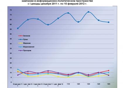 Динамический ряд, отражающий порядок наполнения медиа-потока публикациями о деятельности претендентов на главный государственный пост в Российской Федерации за период с 20 декабря 2011 г. по 15 февраля 2012 г. (график 1), позволяет заключить, что 15 февраля доля присутствия в информационном пространстве Г.А.Зюганова достигла максимального, М.Д.Прохорова – минимального, а иных кандидатов – среднего за анализируемый период значения.