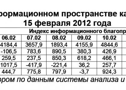 15 февраля 2012 г. в медиа-потоке отмечалось 1023 сюжета о В.В.Путине или 62,3% от общего числа высказываний, озвученных в адрес участников президентской избирательной кампании. В 200 материалах (12,2%) фигурировал Г.А.Зюганов, в 167 (10,2%) – В.В.Жириновский, в 128 (7,8%) – С.М.Миронов, а в 124 (7,5%) – М.Д.Прохоров.