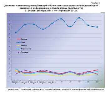 Динамический ряд, отражающий порядок наполнения медиа-потока публикациями о деятельности претендентов на главный государственный пост в Российской Федерации за период с 20 декабря 2011 г. по 15 февраля 2012 г. (график 1), позволяет заключить, что 15 февраля доля присутствия в информационном пространстве Г.А.Зюганова достигла максимального, М.Д.Прохорова – минимального, а иных кандидатов – среднего за анализируемый период значения.