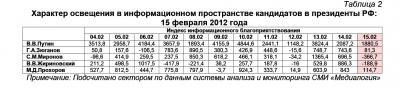15 февраля 2012 г. в медиа-потоке отмечалось 1023 сюжета о В.В.Путине или 62,3% от общего числа высказываний, озвученных в адрес участников президентской избирательной кампании. В 200 материалах (12,2%) фигурировал Г.А.Зюганов, в 167 (10,2%) – В.В.Жириновский, в 128 (7,8%) – С.М.Миронов, а в 124 (7,5%) – М.Д.Прохоров.