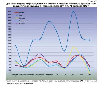 Динамика индекса информационного благоприятствования участников президентской избирательной кампании с I декады декабря 2011 г. по 15 февраля 2012 г.