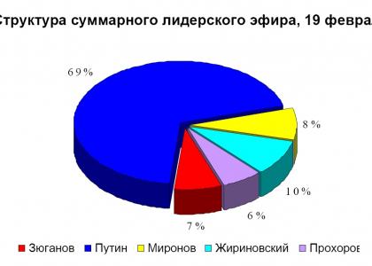 19 февраля на телеканалах основное количество эфирного времени получил В. Путин – 56 минут 47 секунд (69%). В. Жириновскому досталось 10% федерального политического лидерского эфира, С. Миронову – 8%, М. Прохорову – 6%.