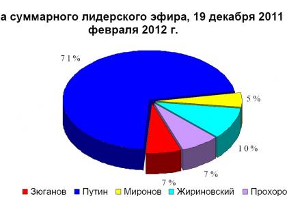 В. Путин получил 71% федерального политического лидерского эфира. В Жириновскому досталось 10%, М. Прохорову – 7%, С. Миронову – 5%.