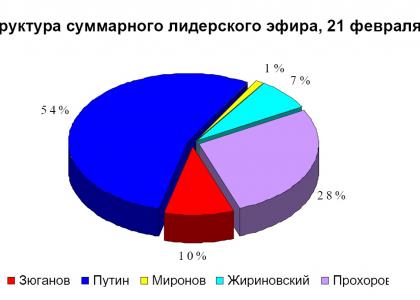 21 февраля на телеканалах основное количество эфирного времени получил В. Путин – 57 минут 19 секунд (54%). В. Жириновскому досталось 7% федерального политического лидерского эфира, С. Миронову – 1%. М. Прохорову – 28%.