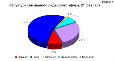 21 февраля на телеканалах основное количество эфирного времени получил В. Путин – 57 минут 19 секунд (54%). В. Жириновскому досталось 7% федерального политического лидерского эфира, С. Миронову – 1%. М. Прохорову – 28%.