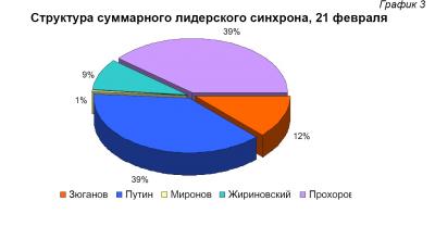 Что касается синхрона (прямой речи) лидеров, то 21 февраля его структура аналогична: В. Путин получил 39% эфирного времени, В. Жириновский – 9%. С. Миронову досталось 1% прямой речи. М. Прохорову – 39%.