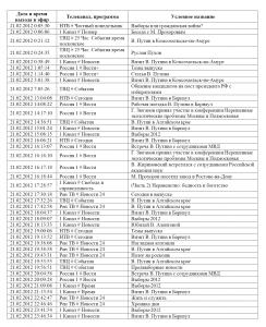 21 февраля на пяти федеральных телеканалах кандидатам в Президенты РФ было посвящено 1 час 45 минут 15 секунд новостного лидерского эфира (Таблица 1).