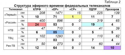 «Единая Россия» получила 1 час 17 минут 23 секунды, что составило 72%. На долю ЛДПР пришлось 11% эфирного времени, М. Прохорову было предоставлено 5%, «Справедливую Россию» показывали менее 1% от суммарной продолжительности политических телепередач.