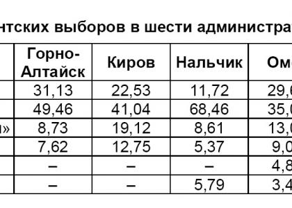Обращает на себя внимание и крайне низкий результат «Единой России» в Омске и Уфе – менее 40%. Во всех столицах субъектов РФ, где 4 марта проходили местные выборы депутатов, «ЕР» набрала менее половины голосов. Исключение составляет лишь Нальчик, но здесь сказывается фактор «управляемого голосования» в национальных республиках.