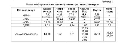 Если в Архангельске поддержка кандидата в мэры находится на среднем уровне по отношению к партийным итогам (думским и президентским), то в Астрахани и в Якутске у кандидатов наблюдается заметное отставание от партийного результата. В Горно-Алтайсе и Нарьян-Маре, наоборот, усилия были сосредоточены в большей степени на выборах мэра, что дало полутора-двухкратное превышение результата местных выборов над думскими и президентскими.