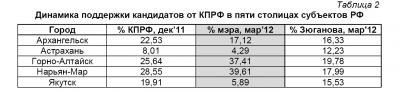 Сравним предварительные результаты местных выборов в марте2012 г. с теми процентными величинами, которые получила КПРФ в этих городах на выборах в Госдуму – три месяца назад, в декабре 2011 года, а также с процентом голосов, поданных за Зюганова на президентских выборах (табл.2):