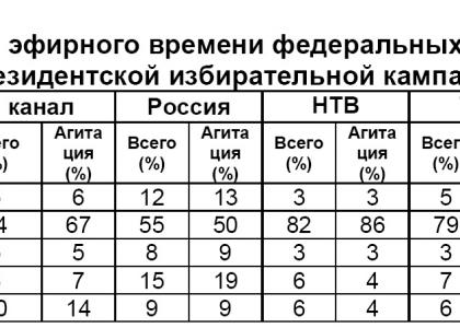 Рассмотрим распределение эфирного времени во время Президентской избирательной кампании на пяти федеральных телеканалах (Таблица 2):