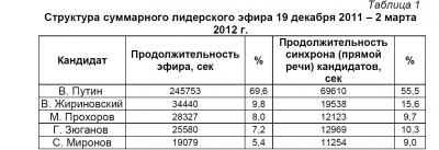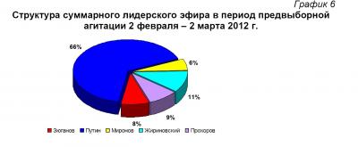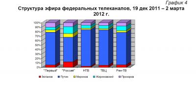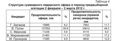 Возросла по сравнению с Думскими выборами лишь доля лидера «Единой России» В. Путина. Он получил 69,6% эфирного времени вместо 66,7% у «ЕР» в период Думских выборов.