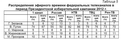 Сравним распределение эфирного времени на пяти федеральных телеканалах во время всей Президентской избирательной кампании и в период предвыборной агитации (Таблица 5):