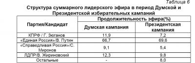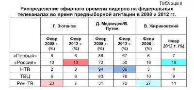 Так, Г. Зюганова в период Президентской выборной кампании показывали лишь 7,2% эфирного времени. В то время, как в Думскую выборную кампанию доля КПРФ в эфире равнялась 11,9%.