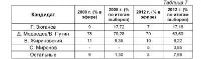 Проанализируем изменение процентного соотношения представленности лидеров от каждой партии в телеэфире и полученных ими процентов в ходе выборов в период двух избирательных кампаний: в 2008 году (с 1 декабря по 29 февраля) и в 2012 году (с 19 декабря по 2 марта). Данные по итогам голосования на выборах 2012 года даны по состоянию на 12.03.2012 года согласно информации ЦИК (Таблица 7)