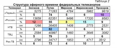 Рассмотрим распределение эфирного времени во время Президентской избирательной кампании на пяти федеральных телеканалах (Таблица 2):