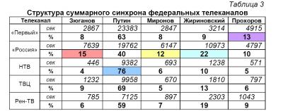 Что касается синхрона (прямой речи) партийцев, то его структура аналогична: В. Путину было предоставлено 49% суммарного времени, либерал-демократам – 17%, справороссам – 9%.