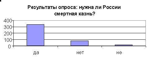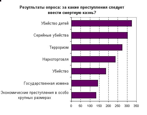 Опрос был проведён на территории Москвы и Московской области, среди людей обоих полов и различных возрастных категории, различного социального статуса, и политических воззрений. Всего были опрошены 445 человек. Респондентам было предложено высказаться «за» или «против» смертной казни. Высказавшиеся «за» могли выбрать одно или несколько преступлений, за которые, по их мнению, должна быть введена смертная казнь. Результаты можно видеть на гистограмме.