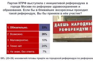 Центр исследований политической культуры России провел общемосковский опрос общественного мнения. Тема опроса - московский референдум КПРФ. Отношение жителей столицы к инициативам КПРФ.
