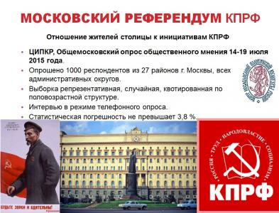 Центр исследований политической культуры России провел общемосковский опрос общественного мнения. Тема опроса - московский референдум КПРФ. Отношение жителей столицы к инициативам КПРФ.