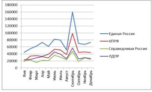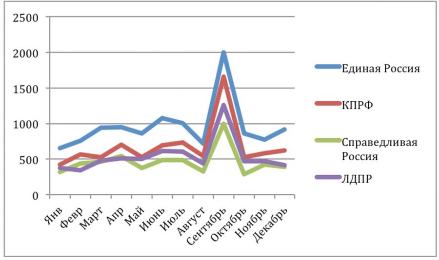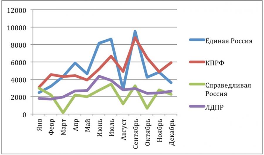 видно лидерство «Единой России» на протяжении всего года и вторую строчку КПРФ.