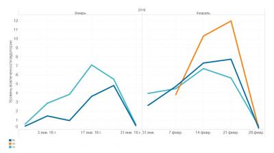 февраля на графике отображается объем публикаций в социальной сети Odnoklassniki. Объемы