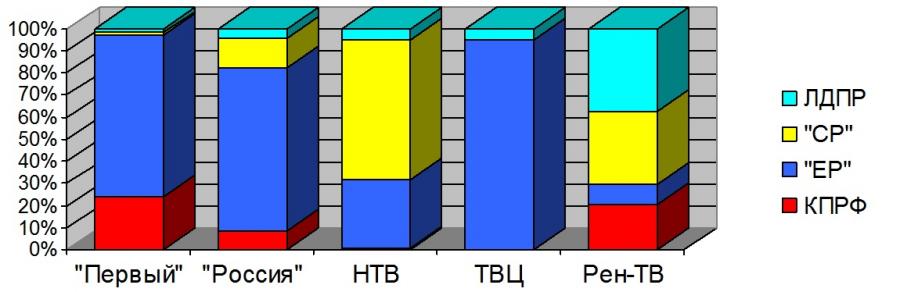 долю телеэфира на ТВЦ (95%). «Справедливой России» наибольшее внимание уделил НТВ