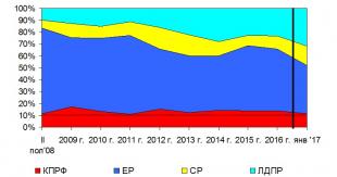образом, в январе 2017 г. по сравнению с декабрём 2016 г. упали доли КПРФ (с 13 до 12%), «Единой России» (с 42 до