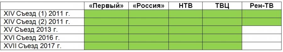 отмечено, какие каналы «заметили» тот или иной Съезд КПРФ (таблица 1).