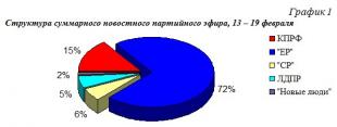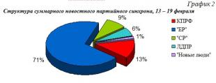 Что касается синхрона (прямой речи) партийцев, то его структура аналогична: единороссам было предоставлено 71% новостного синхрона, либерал-демократам 6%, справороссам 9%, «Новым людям» 1%.