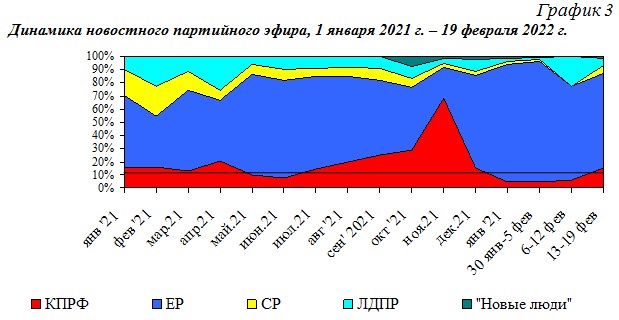 Динамика новостного партийного эфира, 1 января 2021 г. – 19 февраля 2022 г.