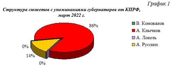 Сотрудниками сектора была проанализирована упоминаемость четырёх губернаторов от КПРФ: А. Клычков (губернатор Орловской области), А. Локоть (мэр Новосибирска), В. Коновалов (губернатор Хакасии) и А. Русских (губернатор Ульяновской области) (Табл.1)