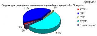 Что касается синхрона (прямой речи) партийцев, то его структура аналогична: единороссам было предоставлено 39% новостного синхрона, либерал-демократам 51%, справороссам 2%, «Новым людям» 4%.