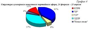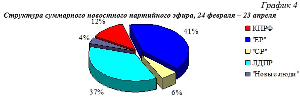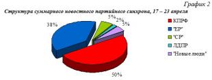 Что касается синхрона (прямой речи) партийцев, то его структура аналогична: единороссам было предоставлено 38% новостного синхрона, либерал-демократам 2%, справороссам и «Новым людям» по 5%.