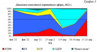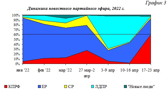 В течение 2022 г. структура новостного партийного телеэфира менялась следующим образом (Гр.3):