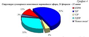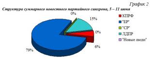 Что касается синхрона (прямой речи) партийцев, то его структура аналогична: единороссам было предоставлено 79% новостного синхрона, либерал-демократам 15%. «Новые люди» и справороссы не выступали.