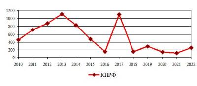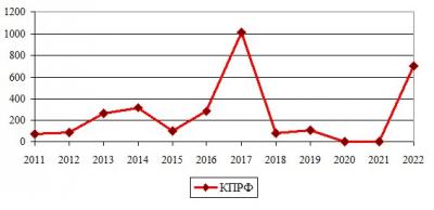 Таким образом, в 2022 году мероприятия КПРФ ко Дню Пионерии освещались на центральных федеральных телеканалах значительно шире, чем в период с 2018 по 2022 гг., но менее, чем в 2017 г. (95-летие Пионерской организации) (График 5).