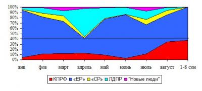 КПРФ: В период с января по сентябрь доля Компартии колебалась в промежутке от 3 до 37%. Наибольшую долю эфирного времени Компартия получила в сентябре (37%), наименьшую – в июне и январе (3 и 4%). Перед днём голосования доля КПРФ возрастала с 11% в июле до 35% в августе и до 37% в сентябре.