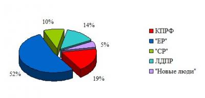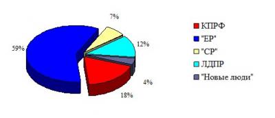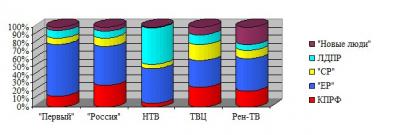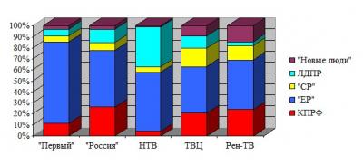 Что касается синхрона (прямой речи) партийцев, то его структура аналогична: единороссам было предоставлено 60% новостного синхрона, либерал-демократам 17%, «эсерам» 7%, «Новым людям» 4%.