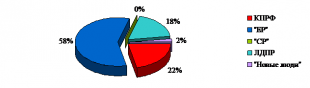 Что касается синхрона (прямой речи) партийцев, то его структура аналогична: единороссам было предоставлено 58% новостного синхрона, либерал-демократам 18%, «Новым людям» 2%, «эсеры» не выступали.