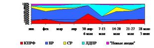Таким образом, в период с 28 мая по 3 июня по сравнению с прошлой неделей возросли доли КПРФ (с 21 до 22%) и «Единой России» (с 43 до 62%).