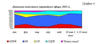 В течение 2023 г. структура новостного партийного телеэфира менялась следующим образом (Гр.4):