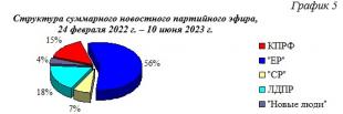 Всего в период с 24 февраля 2022 г. по 10 июня 2023 г. суммарный политический эфир составил 47 часов 31 минуту эфирного времени. При этом 56% эфира получила «Единая Россия», 18% ЛДПР, 15% КПРФ, 7% «Справедливая Россия» и 4% «Новые люди». Компартия заняла третье по освещению место в телеэфире.