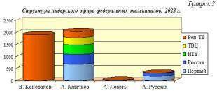 Рассмотрим на графике, как распределялось эфирное время В. Коновалова, А. Клычкова, А. Локотя и А. Русских на пяти ведущих телеканалах в 2023 году (Гр.2).