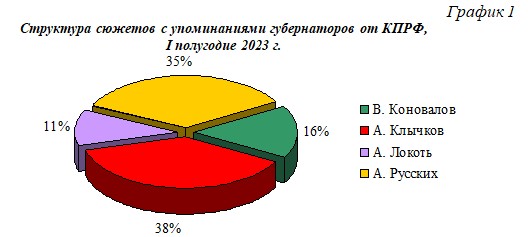 Таким образом, наибольшее число сообщений в период с 1 января по 30 июня 2023 года было посвящено А. Клычкову (37 сюжетов или 38%). Второе по освещению место занял А. Русских (34 сюжета или 35%). В. Коновалов упоминался в 16 сообщениях (16%), А. Локоть – в 11 (11%) (Гр. 1).