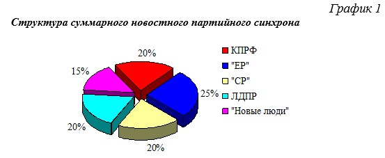 Всего освещение федеральным телевидением выступлений политиков на Форуме «Территория смыслов» заняло 8 минут 58 секунд эфирного времени. Распределение времени среди представителей политических партий отражено на Графике 1.