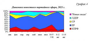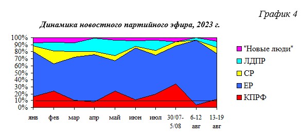 В течение 2023 г. структура новостного партийного телеэфира менялась следующим образом (Гр.4):