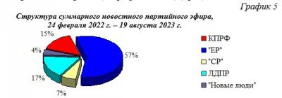 Всего в период с 24 февраля 2022 г. по 19 августа 2023 г. суммарный политический эфир составил 51 час 31 минуту эфирного времени. При этом 57% эфира получила «Единая Россия», 17% ЛДПР, 15% КПРФ, 7% «Справедливая Россия» и 4% «Новые люди». Компартия заняла третье по освещению место в телеэфире.