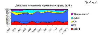 В течение 2023 г. структура новостного партийного телеэфира менялась следующим образом (Гр.4):